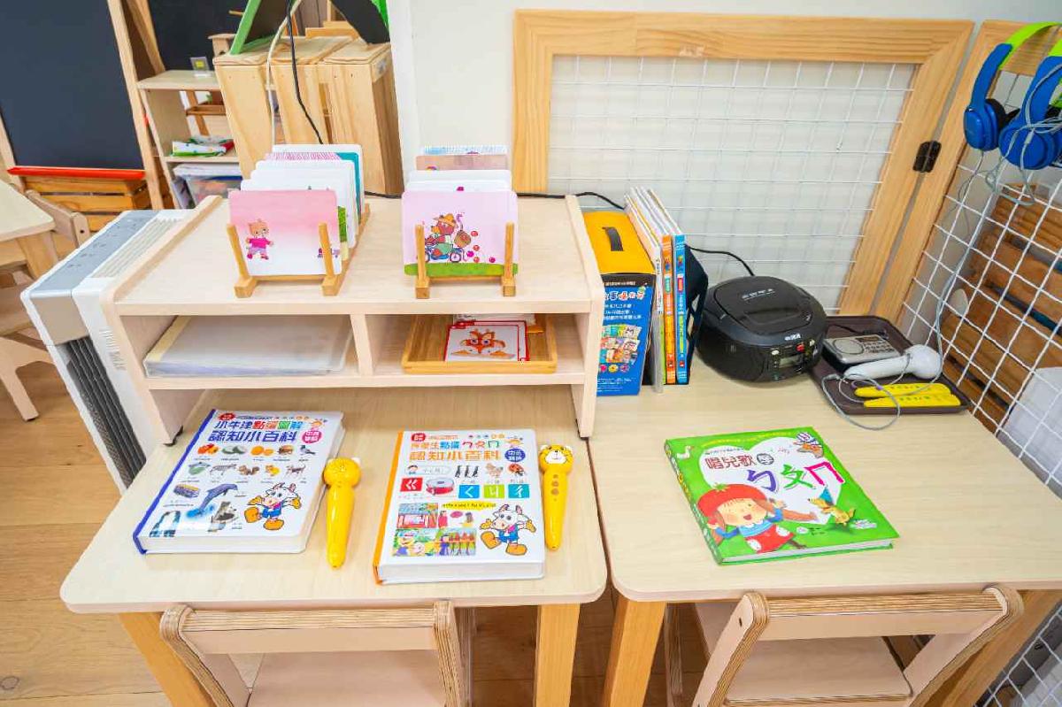 含聽說讀寫(手的練習、視覺區辨、錄音、有聲書、聽覺區辨…),提供繪本、書籍、錄音機、故事CD、圖卡、故事接龍、兒歌、紙筆等鼓勵孩子敘說及想像,引發編創故事的動機,學習與人溝通分享