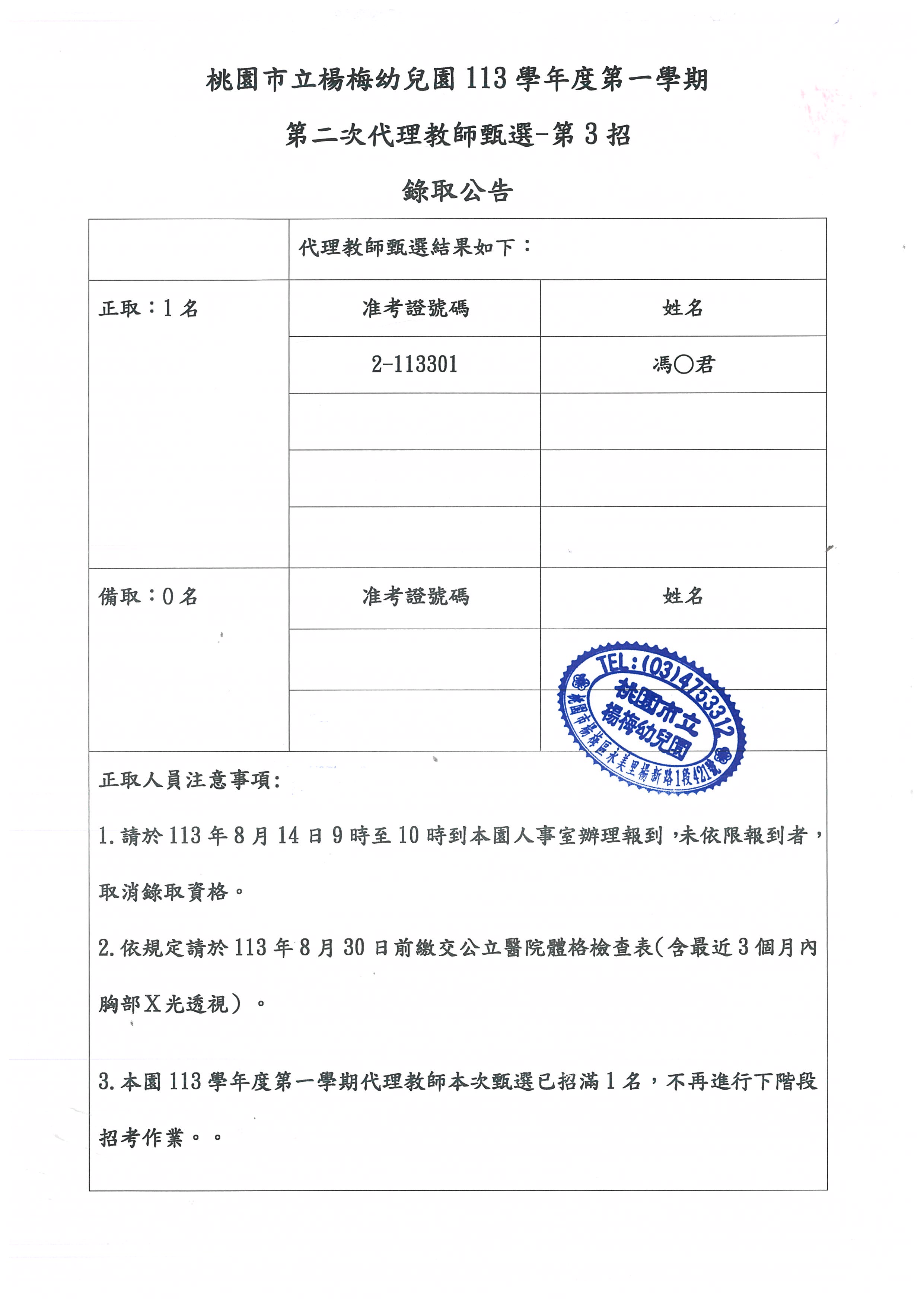 桃園市立楊梅幼兒園113學年度代理教師第二次甄試錄取公告
