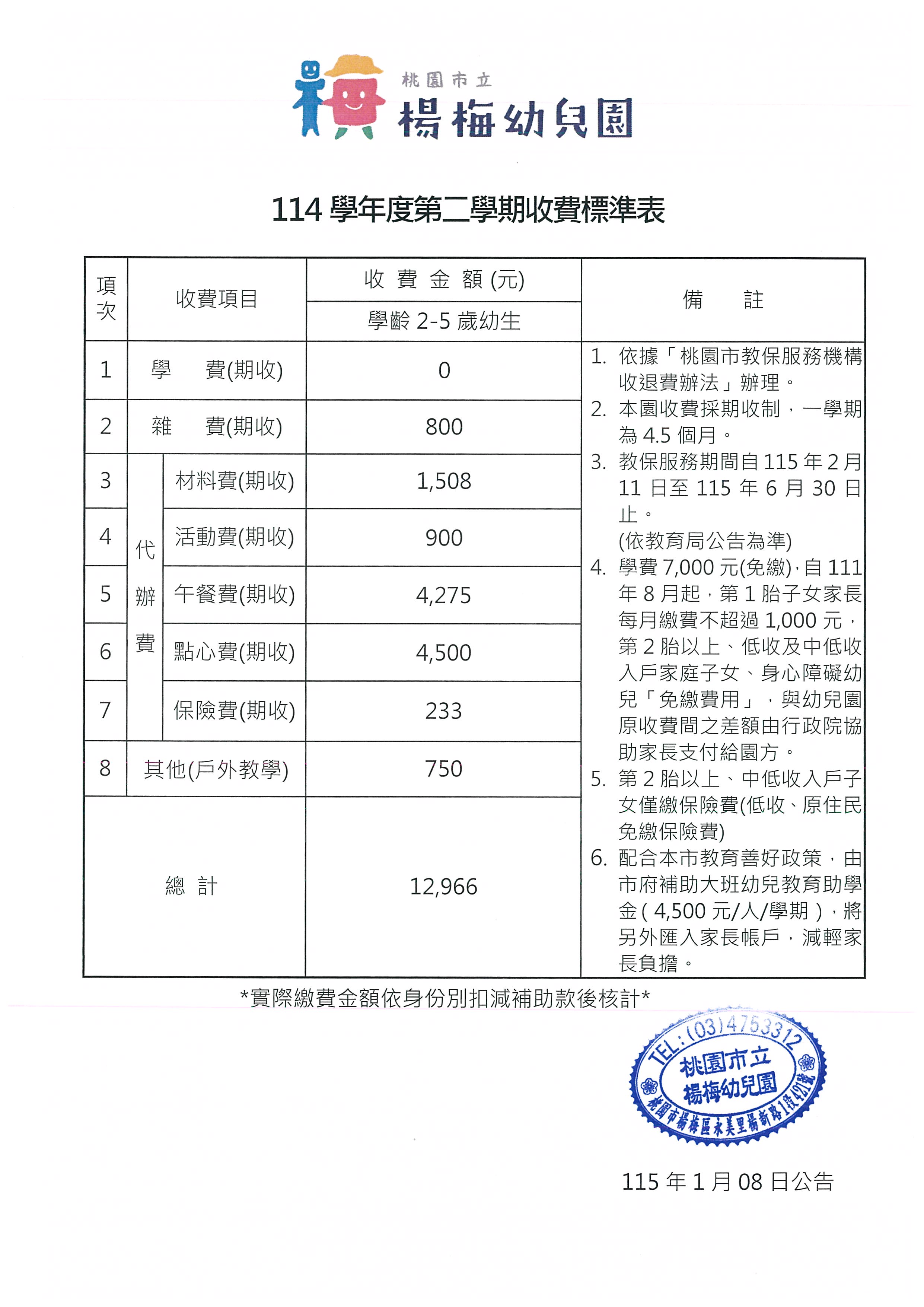 ⭐️桃園市立楊梅幼兒園114學年度第二學期收費標準表